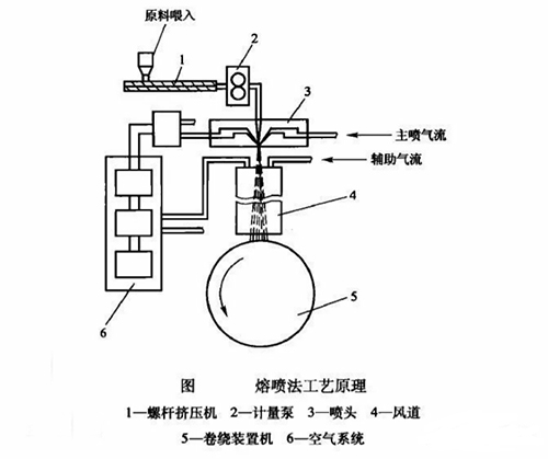 熔噴法生成的無紡布纖維更細,表面積更大,具有更好的過濾性、屏蔽性、絕熱性和吸油性,這些是其他工藝生產(chǎn)的無紡布所不能比擬的。下圖為熔噴法工藝生產(chǎn)熔噴布原理圖。