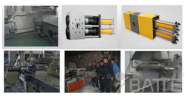 (2)小型的拉條冷切造粒工藝一般都用多網(wǎng)往復(fù)過濾的換網(wǎng)器(如:可采用雙柱四工位液壓換網(wǎng)器、雙柱四工位反沖洗液壓換網(wǎng)器),因為它帶穩(wěn)壓及自動排氣機構(gòu),換網(wǎng)時不停機、不斷條、不影響正常生產(chǎn),粒子光滑無氣泡。口模與換網(wǎng)器一體化設(shè)計制造,合理、經(jīng)濟(jì)、實惠!